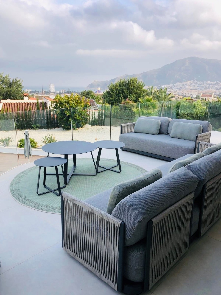 Een oprijlaan leidt u naar de ingang van deze moderne villa. Bij binnenkomst in de hal kunt u naar rechts of links van de villa. Aan de rechterkant is de zeer ruime woonkamer, grenzend aan een open keuken (naar keuze) en de eetkamer, beide met uitzicht op zee. Naast de keuken bevindt zich het gastentoilet en de wasruimte. Via de woonkamer bereikt u het ruime en panoramische terras met uitzicht op zee en de beroemde Sierra Helada del Albir, zwembad en tuin, naast een terras aan de keukenzijde, zijn er vele mogelijkheden.Aan de linkerkant als u binnenkomt, vindt u 3 slaapkamers, waarvan 2 ruime met en-suite badkamers. Ook de badkamers kunnen naar eigen smaak worden aangepast.Op de begane grond hebben we via een trap toegang tot de kelder. Hier vindt u een gastenappartement met woonkamer en open keuken, 2 slaapkamers met en-suite badkamers en een multifunctionele ruimte die bijvoorbeeld dienst kan doen als wijnkelder.Vanaf deze verdieping heeft u toegang tot het prachtige zwembad, gelegen op het zuidoosten. omgeven door een tuin van gegarandeerde privacy. Hier vindt u ook een gesloten garage met automatische deur.