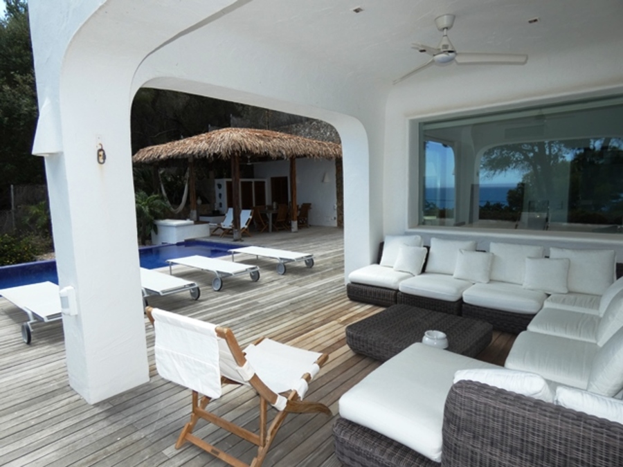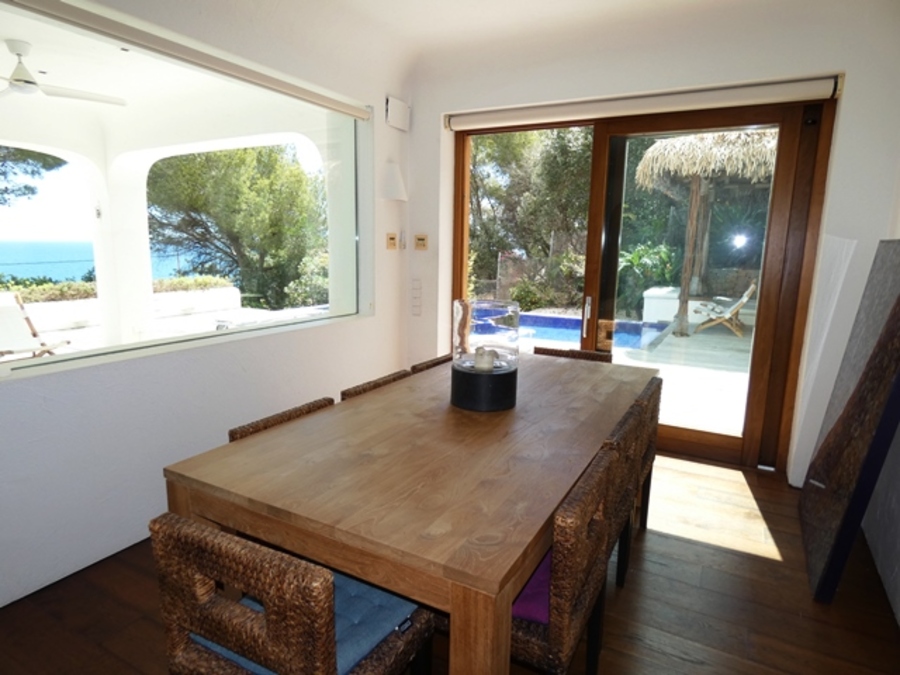 This beautiful villa in Las Rotas has a genuine Ibizan style in a quiet road on the edge of the Montgó National Park, and is just a few minutes walk to the sea. Every corner of the property has been carefully thought through, with all rooms having fabulous sea views, as well as strategically placed windows to allow the sense of the surrounding nature being part of the interior. The lower entry level is accessed directly from the parking area through a lobby, with a large double bedroom, and a stunning shower room. A few steps up to the main level, also accessed separately with a fabulous double door, has a spectacular living room with a suspended log-burning stove, a kitchen, a bodega, a bedroom, and a walk-in shower room. The upper level features the spectacular master bedroom, with a large bathroom, and a dressing area, as well as access to a private terrace. This floor has a further large bedroom with a study area and a spacious bathroom. The surrounding garden offers privacy, and has a sensational chill-out area, with a salt pool, a fully equipped kitchen, a BBQ area, and further terraces to enjoy the views. With a closed garage, as well as a parking pergola, there is room for up to 5 cars. Just a five-minute drive into Dénia, and incredible walks on the doorstep. This is a dream property that was built with specially selected materials that reflect a Mediterranean lifestyle. A visit is highly recommended.