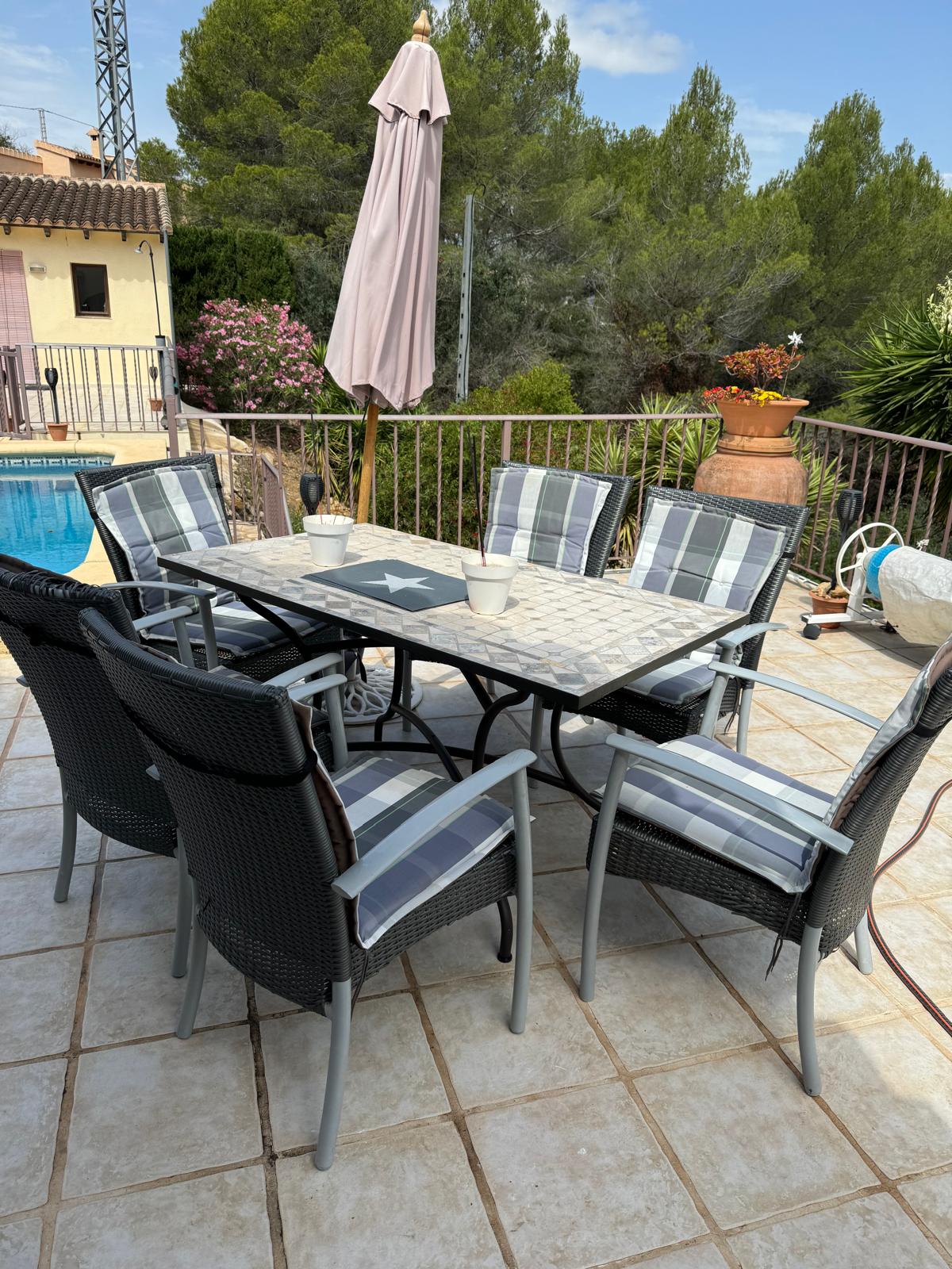 An exceptional and stunning country house for sale offering peace and tranquillity, located on the outskirts of the village of Lliber, with amazing south west facing views across the Jalon valley.The property was built by the present owners externally for enhanced privacy and internally adding home comforts for today’s modern living, such as under floor heating, all without compromising any of the original charm or character of what is a much loved and impressive family residence.PROPERTY DETAILS The property is extremely well presented allowing the discerning buyer to move straight in and start enjoying Mediterranean living in an authentic and picturesque setting.This very private property is accessed via electric gates with a long drive and ample parking for several vehicles. An impressive main frontage with entrance door opening into the spacious hallway, with guest toilet, cloak room and large store room. The main living area is a wonderful room that immediately catches your eye due to the abundant natural light flooding into the area creating a welcoming ambience, further enhanced by the wraparound glazed naya with stunning views of the mountains. From the lounge you can access the naya via two sets of double doors while another set leads you to the large modern kitchen with breakfast bar and kitchen island. There is also a large pantry with plenty of shelving and storage and a separate utility room/laundry room with access to outside. The kitchen is very light having a large window with a view to the pool area and door leading to the amazing naya.The naya has glass curtains which can be opened fully plus a set of sliding doors, one side you have room for sofas and dining table the other side you have a Jacuzzi and sauna. The upstairs continues to delight with 5 large double bedrooms. The master bedroom has an large en-suite, fitted wardrobes and has a terrace where you can relax and take in the amazing views. Bedroom 2 and 3 have en-suites with bedroom 2 having a walk in wardrobe and bedroom 3 having fitted wardrobes. Bedroom 4 and 5 share a large guest bathroom and both have fitted wardrobes. All the bedrooms are light and large, plus bedroom 5 has a great view of the pool area. Externally, the property has lush verdant Mediterranean gardens with a variety of trees, especially chosen by the owner to further insure privacy, in addition to keeping it low maintenance with easy access. The wonderful dry stone walls have been professionally restored by traditional tradesmen. The pool is a 5m x 10m pool with roman steps and surrounded by terraces and large pergola with BBQ area. There is also a separate dwelling with kitchen, BBQ, and bathroom.The large double garage could be divided to have a work room, Gym or games room, and on the opposite side of the plot there is another plot which is ideal for extra parking and certainly would accommodate a campervan/mobile home.This magnificent property has many extra benefits including oil under floor heating, a new pellet burner, solar panel hot water, sauna, Jacuzzi, storage, double glazing, hot and cold air con, totally enclosed with electric gated access, pedestrian gated access and ample parking, extra plot for parking. For year round living, a glazed summer and winter naya entertainment lounge and dining area. The Spanish lifestyle is all about living outdoors, enjoying time with friends and or family. This property allows you to inhale the fresh air and immerse yourself in a stunning natural setting on your own magnificent property in comfort and contemplate the stunning valley and mountain views that lie just beyond.LOCATION The pretty village of Lliber, one of the smaller villages in the Jalon Valley is situated beside the river Xaló in the shelter of the Muntanyeta. The streets of the old town make for a pleasant stroll. Its traditional houses preserve their natural stone façades, their old wooden doors and the enchantment and beauty of the architecture of the area, closely tied to the country and country life. The neoclassic style Church of Sant Cosme i Sant Damià is at the Centre of the village and it is worth walking as far as El Calvario to take in the magnificent views over La Vall.The surrounding mountains of Lliber offer a magnificent back drop to what is a stunning area of natural beauty with breath-taking landscapes offering a taste of “Real Spain” an area dubbed Costa Blanca´s “Jewel in the Crown” by the British travel press and with an average 320 days of sunshine per year.Extending from Alicante, the Northern Costa Blanca stretches for miles up towards the city of Valencia and within a short 15 to 20 minute drive from Lliber you will find a wealth of clean blue flag sandy beaches and coves to explore.This area of the Costa Blanca has the best all year round temperature with a climate that is recognized as one of the best in the world by the World Health Organization.