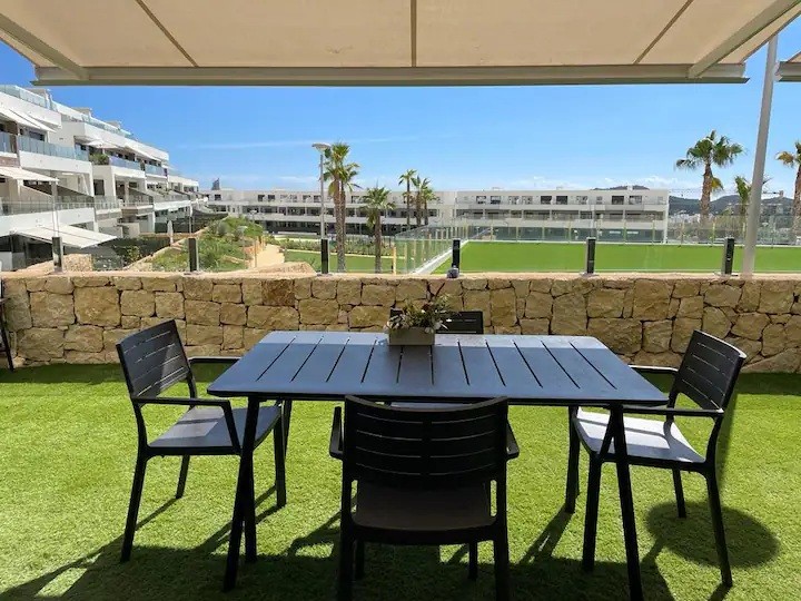 This modern luxury apartment in Finestrat offers beautiful sea views and excellent communal facilities, including indoor and outdoor swimming pools, a gym, sauna, paddle tennis court, children’s playground, landscaped gardens, a terrace, and private parking.The fully air-conditioned apartment features two double bedrooms with built-in wardrobes, two bathrooms, a bright living area, and a fully equipped open-plan kitchen. An additional room can be used as a home office or extra bedroom.The beach and Benidorm center are 4 km away, Finestrat center is 3 km away, Alicante Airport is 59 km away, and a shopping center is just 1 km from the property.