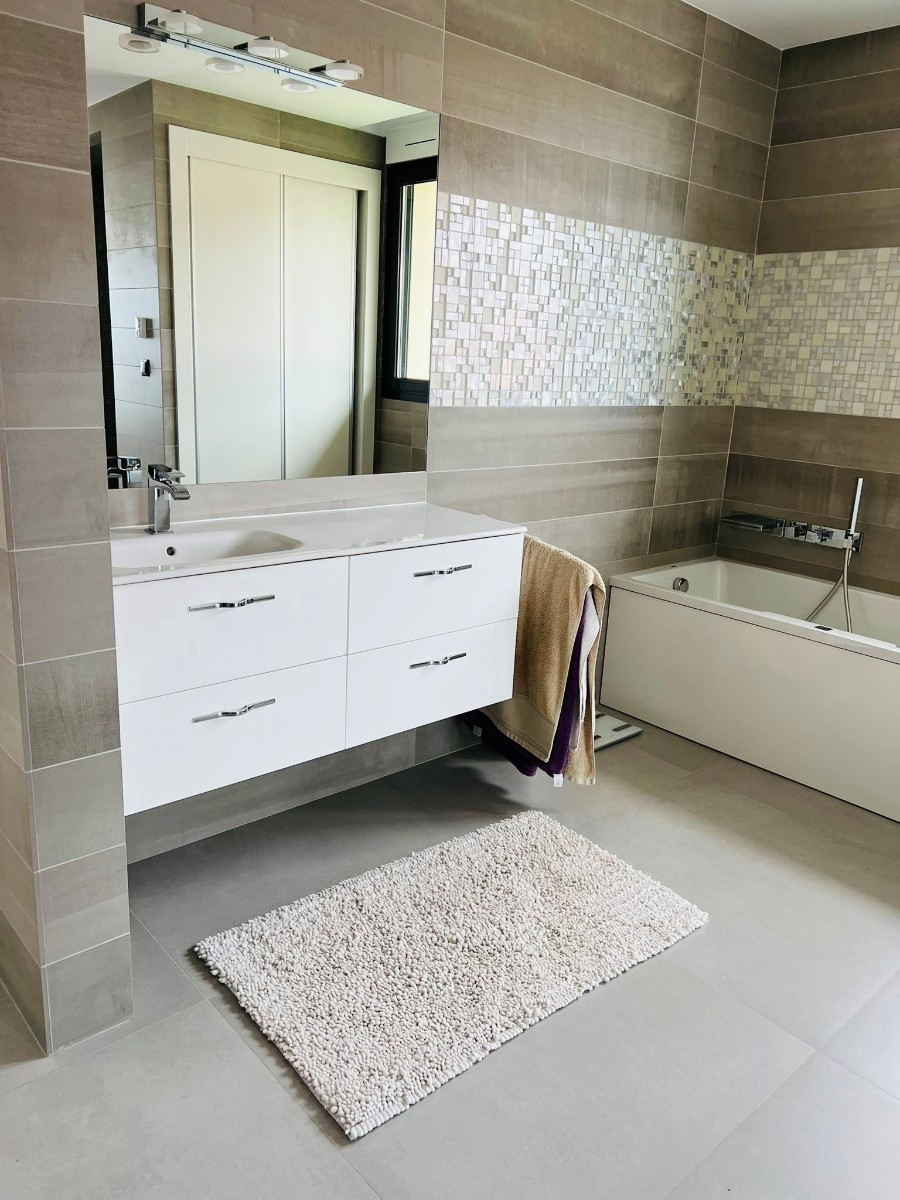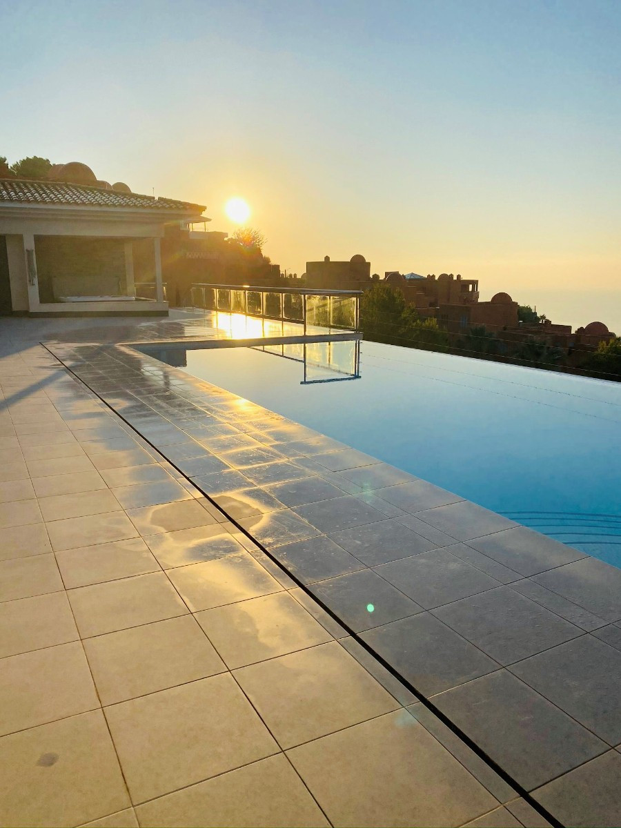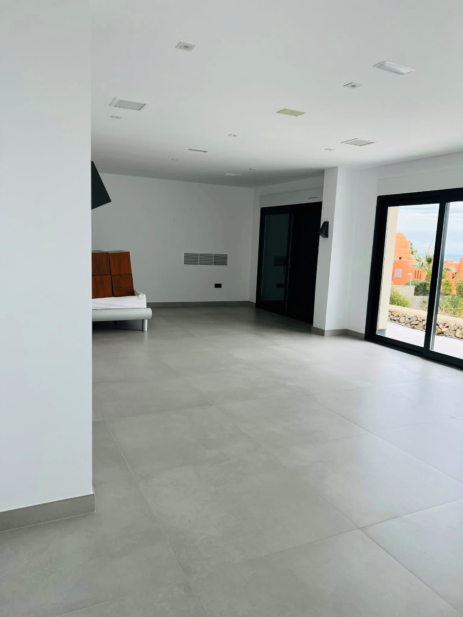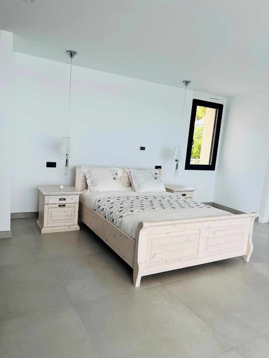 Op de eerste verdieping is er een zeer grote woon-eetkamer van 190m2 met een open keuken van 80m2 die een gevoel van grote ruimtelijkheid geeft. Er is ook een wasruimte van 16m2 en een toilet. Op deze verdieping bevindt zich ook de hoofdslaapkamer van 32m2 met een complete kleedkamer van 12m2 en een badkamer en suite van 22m2 met bad en douche. Deze slaapkamer heeft ook directe toegang tot het terras van 240m2 waar we een ruimte vinden voor de jacuzzi, het grote buitenzwembad van 10mx4m met prachtig uitzicht en de buitenkeuken 16m2.