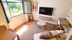 It includes air conditioning, electric blinds, mosquito nets, a smart TV in both the living room and bedroom, and a covered porch with a pergola leading to a landscaped patio. It also has a ground-floor storage room with a washer-dryer, solar panels (minimal electricity cost), and independent access, ideal for a vacation rental.