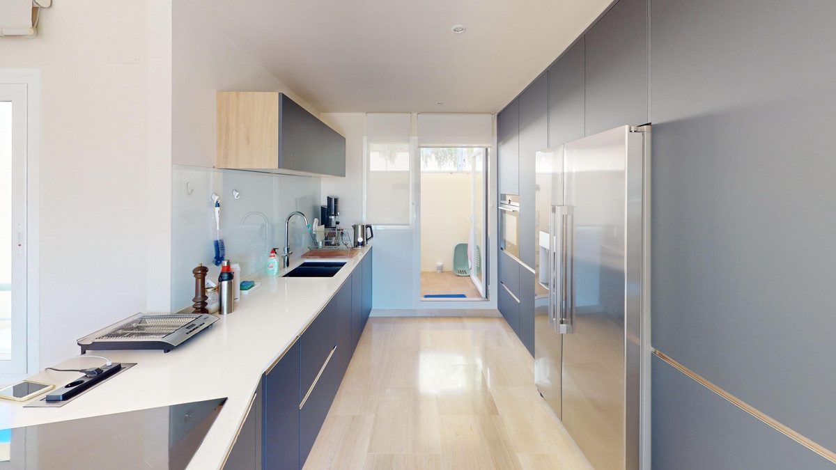 Deze moderne penthouse in Mijas, Málaga, combineert comfort en stijl op perfecte wijze. Het ligt direct aan een golfbaan en biedt een indrukwekkend uitzicht op zee, zodat je zowel kunt genieten van de rust van de green als van het panorama van de kust. De open woonruimte beschikt over vloer-tot-plafond ramen die het interieur overspoelen met natuurlijk licht en een adembenemend panoramisch uitzicht bieden op het omliggende landschap. De woonkamer is smaakvol ingericht met een grote witte hoekbank, aangevuld met kleurrijke tapijten die warmte toevoegen aan de verfijnde vloeren. De strakke, moderne keuken is voorzien van navyblauwe kasten, witte werkbladen en hoogwaardige roestvrijstalen apparatuur, wat zorgt voor een elegante en functionele kookruimte. De drei badkamers van het penthouse zijn stijlvol afgewerkt, waarvan één met een zwevende dubbele wastafel in warme houttinten en een glazen douche. De master bedroom is een oase van rust met directe toegang tot het privéterras. Deze kamer beschikt over een hemelbed, een ruime inloopkast en een luxe en-suite badkamer met zowel een bad als een douche. De tweede slaapkamer biedt eveneens een prachtig uitzicht en is ingericht met een comfortabel tweepersoonsbed. Daarnaast is er een aparte werkruimte met een moderne bureaustoel en veel natuurlijk licht. Het hoogtepunt van deze woning is het privéterras, compleet met een zwembad en een panoramisch uitzicht op de heuvels en de natuur. Verder beschikt het penthouse over twee parkeerplaatsen en twee bergingen. Bewoners kunnen ook gebruikmaken van uitstekende gemeenschappelijke voorzieningen, waaronder een groot zwembad, een verwarmd zwembad en een buitenkeuken die voor iedereen toegankelijk is. Met de doordachte indeling, luxe voorzieningen en toplocatie in Urbanización Cerrado del Águila biedt dit penthouse de perfecte balans tussen comfortabel wonen en de mediterrane levensstijl aan de Costa del Sol. We zijn blij dat we dit droomhuis binnenkort aan u mogen voorstellen, hetzij persoonlijk, hetzij via een virtuele bezichtiging. Want deze wereld is uniek – net als onze Axarquía. In Andalusië. Aan de Costa del Sol. Hier, aan de zonnige kant van het leven…