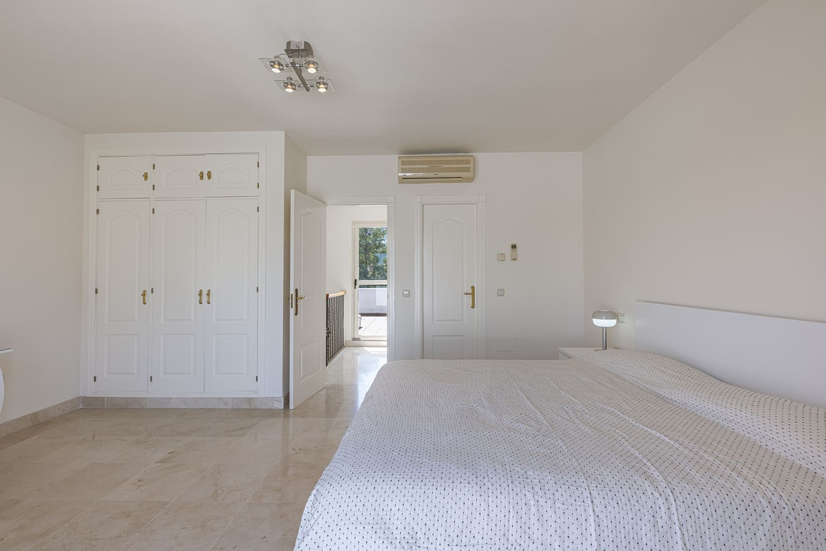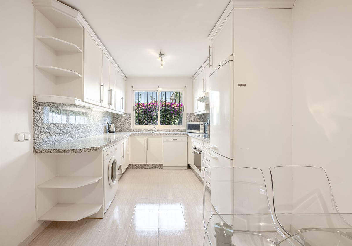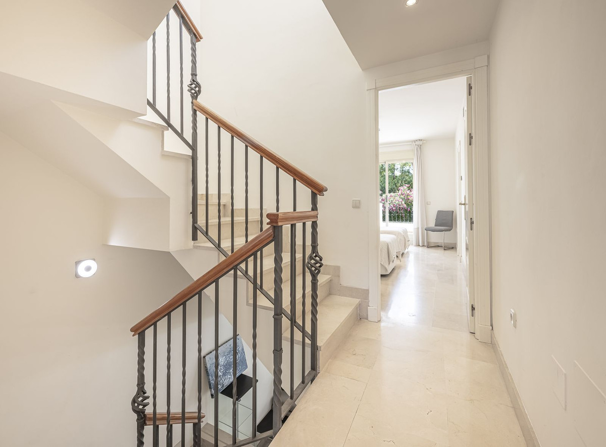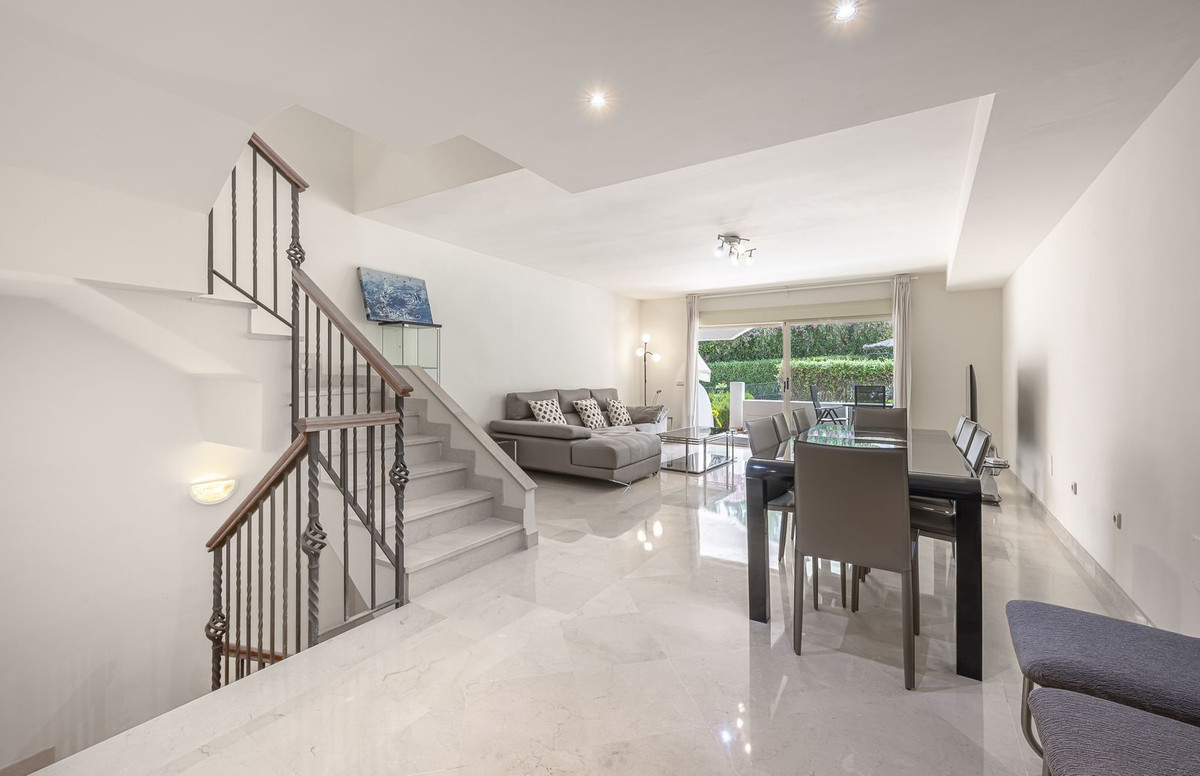 Elegant Family Townhouse in the Heart of Nueva Andalucía, Marbella´s Golf ValleyWelcome to this beautifully maintained and spacious townhouse, ideally situated in the prestigious Golf Valley of Nueva Andalucía. This four-level home combines comfort, style, and convenience—perfect for family living or as a luxurious holiday retreat.The main floor welcomes you with sunny patio, leading into a large, fully equipped independent kitchen. The generous open-plan living and dining area flows seamlessly onto a west-facing terrace and private garden, with direct access to the community swimming pool—ideal for relaxing or entertaining. A guest toilet adds practicality to this level. On the first floor, you'll find two generously sized bedrooms, each with its own ensuite bathroom and private terrace, offering peaceful retreats with ample natural light. The top floor hosts a spacious bedroom featuring an ensuite bathroom, a large terrace with panoramic views of the golf course, and a sunny west-facing solarium for tranquil evenings.The expansive basement with natural light is a versatile space, perfect for -another bedroom, home cinema, playroom, office, or music studio. It also includes a guest bathroom, a laundry area, and direct access to an underground private garage with space for two vehicles. The house is constructed with the best quality materials and finishings. Located in an exclusive and private complex with very few neighbors. Enjoy tranquility in the beautifully landscaped gardens, swimming pool and gym area, Just a short drive to Puerto Banús and Marbella, it's an unbeatable location for golf lovers and those seeking the best of Costa del Sol living. Move-in ready—don't miss this exceptional opportunity!