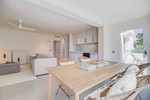 De ruime woonkamer met open keuken zet meteen de toon: licht, luchtig en gemaakt voor een moeiteloze dagelijkse routine. Grote ramen laten het zonlicht binnen en verbinden de woning direct met het zuidwestgerichte terras – een verlengstuk van de woonkamer waar je het hele jaar kunt genieten van warme middagen, gouden zonsondergangen en de zachte mediterrane bries.