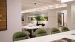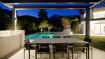 Terrace living area with luxury glass balustrade and metal pergola covering the entire area.