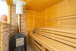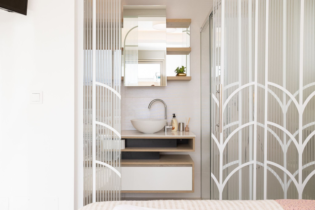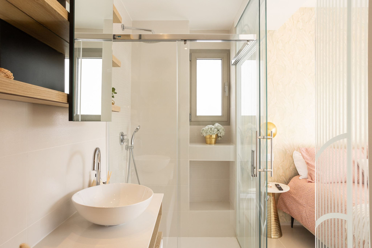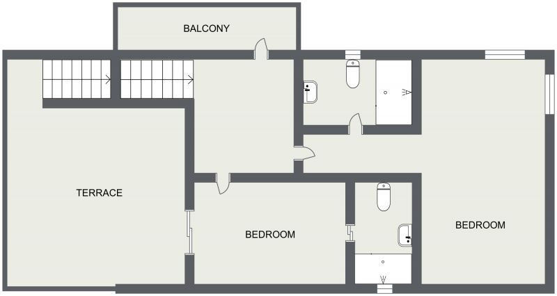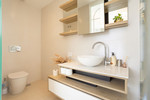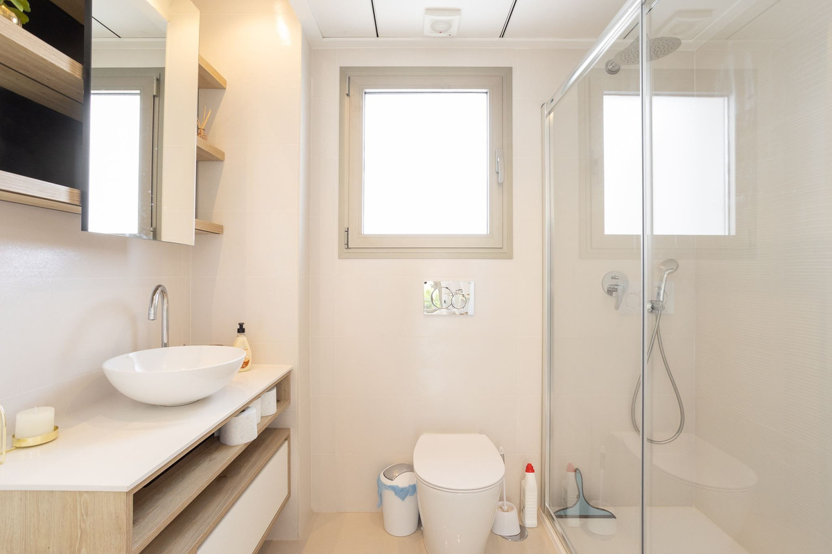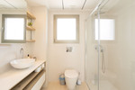 De drie badkamers zijn voorzien van een toilet, wastafel en douche.